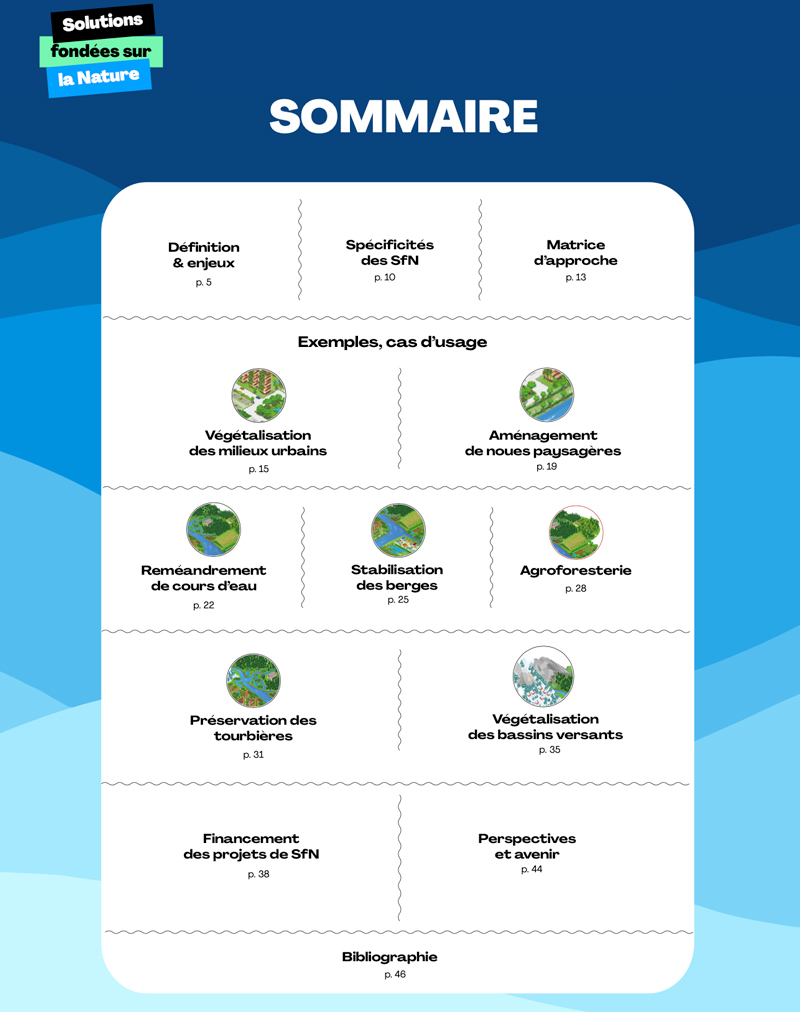 Partout en France, des collectivités pionnières portent des projets ambitieux, localisés à des échelles différentes. De nombreux projets réussis de Solutions fondées sur la Nature ont déjà été mis en œuvre, démontrant leur efficacité dans divers contextes : de la restauration des zones humides à la végétalisation des bassins-versants, en passant par l'agroforesterie. Ces solutions couvrent un éventail très large de domaines tels que la lutte contre le changement climatique, la gestion des risques naturels, la sécurité alimentaire et la santé. (…)"